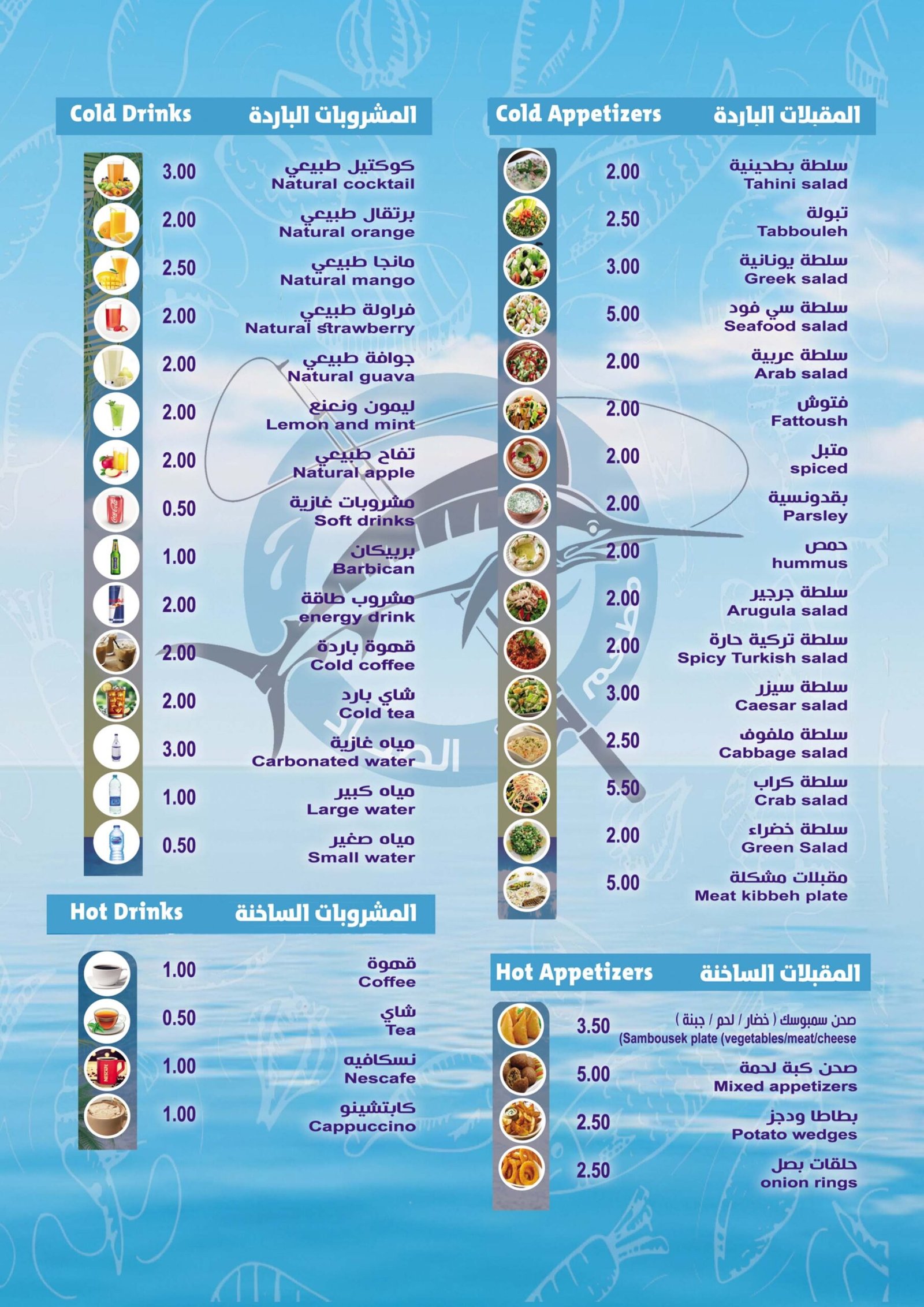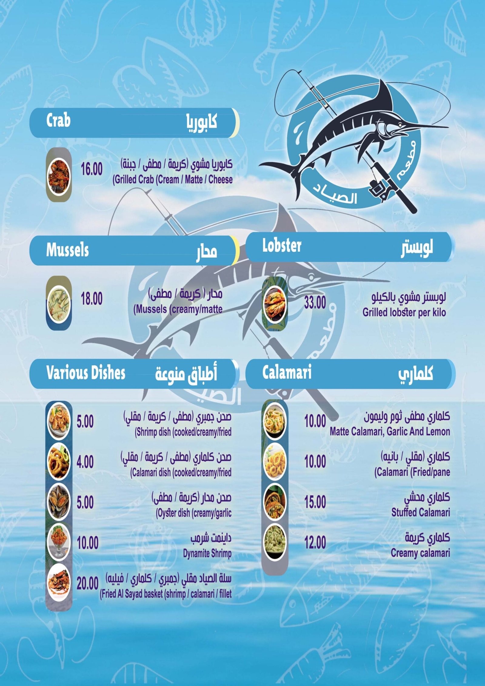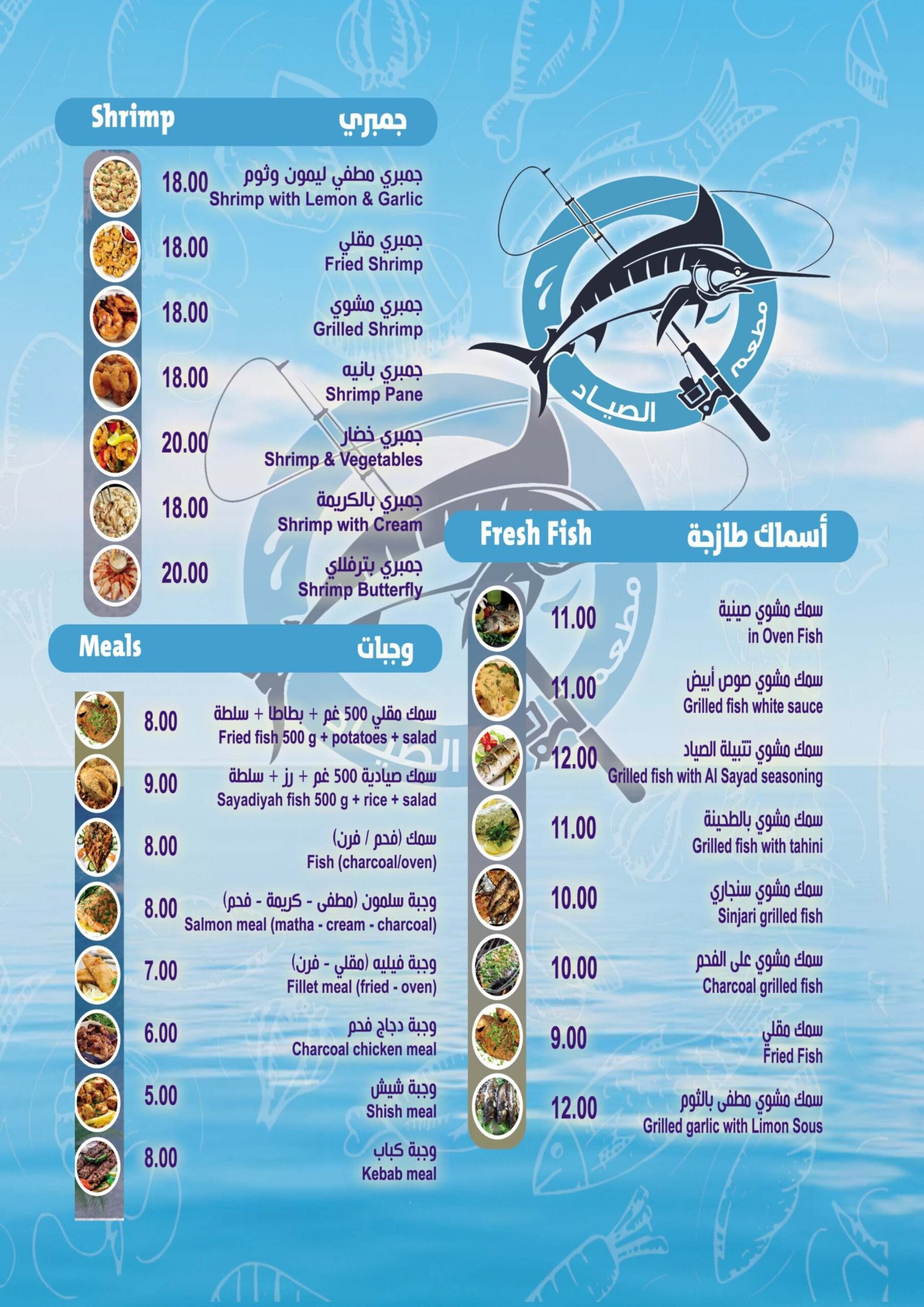 Our menu is built around today’s catch — fresh, local, and cooked to perfection. Browse the full selection below and see why Al Sayyad Seafood is Aqaba’s favorite place for authentic, made-to-order seafood.